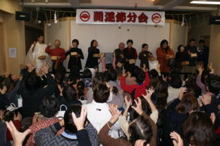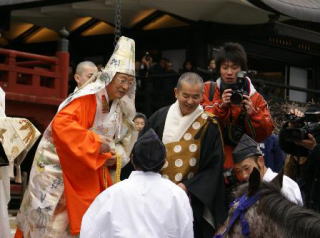 27日、恒例の「開運節分祭」が開催され、お天気にも恵まれ、今年は260名以上の参詣者にて無事終了しました。 9時30分から本堂で、節分祭大法要が営まれ、世界の平和と人類の幸せにを祈りました。その後、境内での水行、毎年、私も行うのですが、年々歳と共に、お見せできるような状況ではなくなってきました。それに今年は、若い僧侶の方もデビューしましたから、その差30歳これは結構、比較対照となります。肌のつや、水のはじき具合、見る人も慣れてくると、そういうところがチェック対象となるようです。 ともあれ、いつもより寒かったので、かぶる方としては効果的でしたが、初めてご覧なった方の感想がメールにありましたので、紹介しておきます。 〖個別祈祷もさることながら、水行なんて私達はストーブ側にいましたが正面から見てスゴイスゴイって興奮してました(^-^)娘も写真撮ってました。〗 続いて、水行中に本堂では、個別祈祷用に特設祈祷所が設営され、10~15名くらいづつ、ご祈祷をしていきます。 日蓮宗のご祈祷は、大荒行堂にて百日間の荒行を終えた僧侶(修法師と言います)が、木剣(ぼっけん・数珠で音を鳴らす)にて、加持祈祷(かじきとう)を行います。特設の祈祷所は、独特の雰囲気もあり、6名の修法師に囲まれてのお経の迫力と木剣にて、皆さん心身ともにシャキとするそうです。 又、一人一人に、撰経(お経がかかれた巻物)にて、エネルギーを付与していきます。 ご祈祷が済むと、豆(三角形の袋詰め)と、飴、チョコ、五円玉の入った升を受取り、皆さんに撒きます。それぞれ豆まきを行い、そして拾う方になり、充分、拾ったら後は、ぜんざいを召し上って頂き、さらに福引をして帰るということになります。その繰り返しを2時間続け、さらに小休止後、1時間行いました。 修法師の皆さん、本当にお疲れ様でした。 今年の福引は、ニンテンドウDSライトや。リゾート券。お米など。檀信徒の方のご寄付もあり、空くじはありませんから、皆さんに楽しんで頂けたかと思います。 開運節分祭は実行委員会として、総代さんをはじめ40名近くの檀信徒の方が手伝って頂けます。皆さんがそれぞれの役配をこなして頂けるので、スムーズに進行できます。「おらが寺」という意識で行って頂けるので本当に感謝です。皆さんお疲れ様でした。 すべてが終わり、夜、家族で反省会のようなことになりました。すでに来年はこうするればいいと、気分はもう来年の節分祭に向けて始まりました。 |
